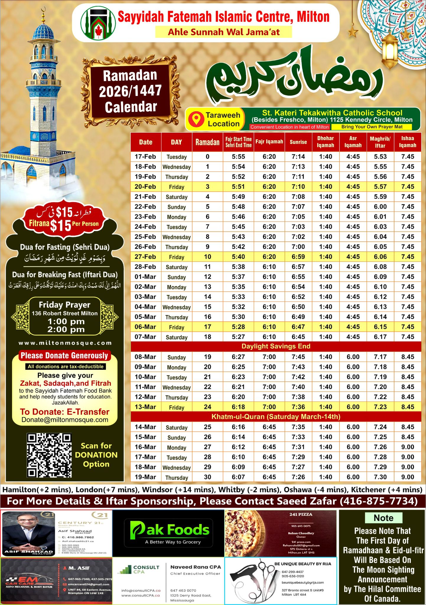 First Khutba 1:40 PM Second Khutba 2:45 PM **Milton Fair Ground** 136 Robert Street, Milton |